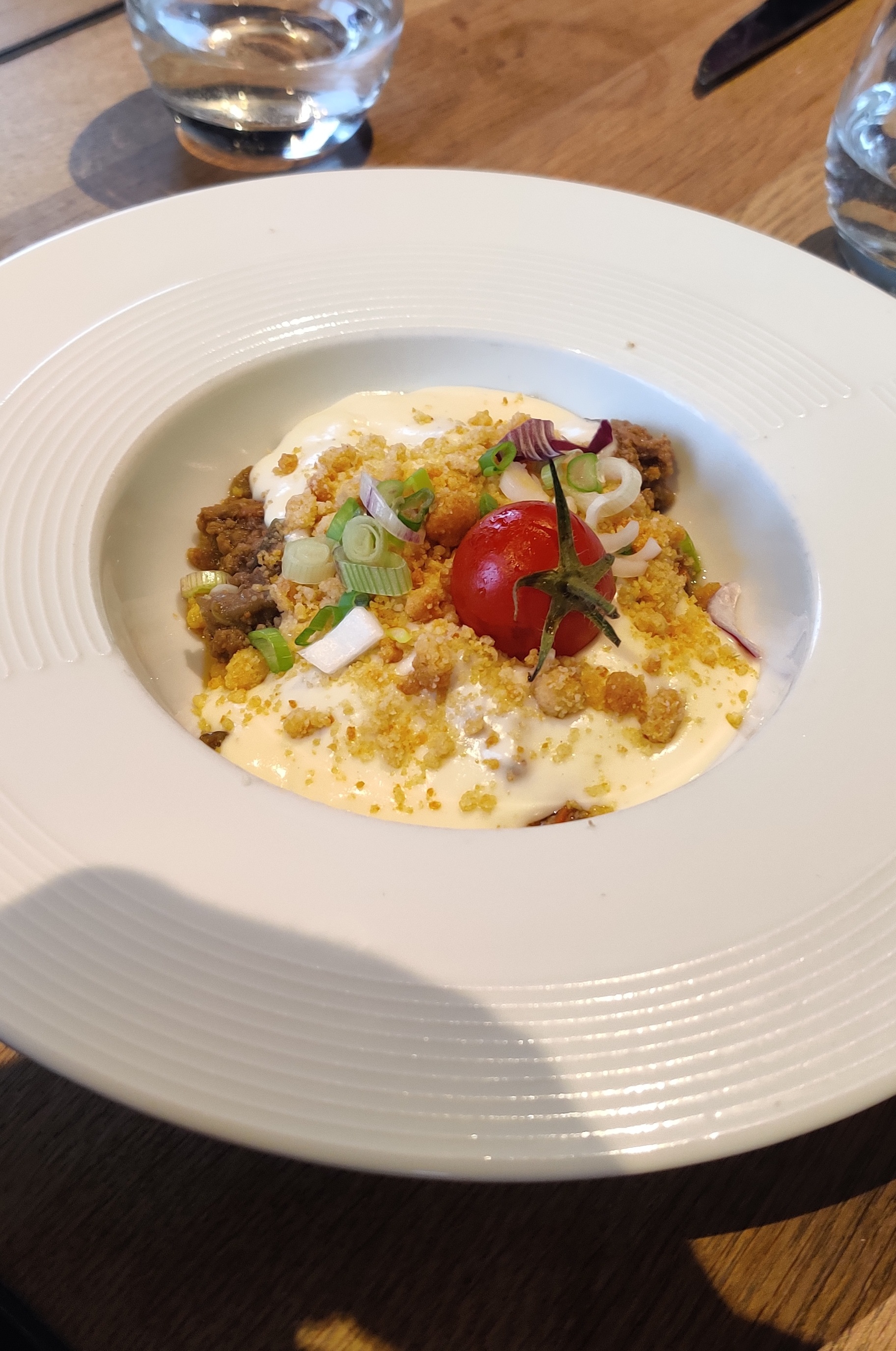 Attiré par les bons retours, nous nous sommes laissé tenter. Le restaurant est plutôt chaleureux et vivant même si la zone est vraiment tristounette. La faim est là et nous partons donc pour un apéro-entrée-plat-déssert, pour un prix tout à fait acceptable de 24€. Bon point, on nous propose de la bière locale. L'entrée est un samoussa de boeuf roulé un peu à l'arrache, heureusement que la sauce amène du goût parce que la viande est sèche et plutôt fade. Choix peu judicieux de ma part de prendre le crumble de boeuf où tout est bon...sauf la viande, à nouveau désertique, dommage. La crème brûlée pour finir était simple mais très bonne. Gros point négatif cela dit, il a fallu 2h au total pour notre repas, certes le restaurant était plein mais c'est beaucoup trop long pour un midi. J'ai l'impression que si nous n'avions pas interpellé la serveuse nous y serions encore. Malgré cela, tout le personnel est sourriant et à l'écoute. En résumé, très mitigé.