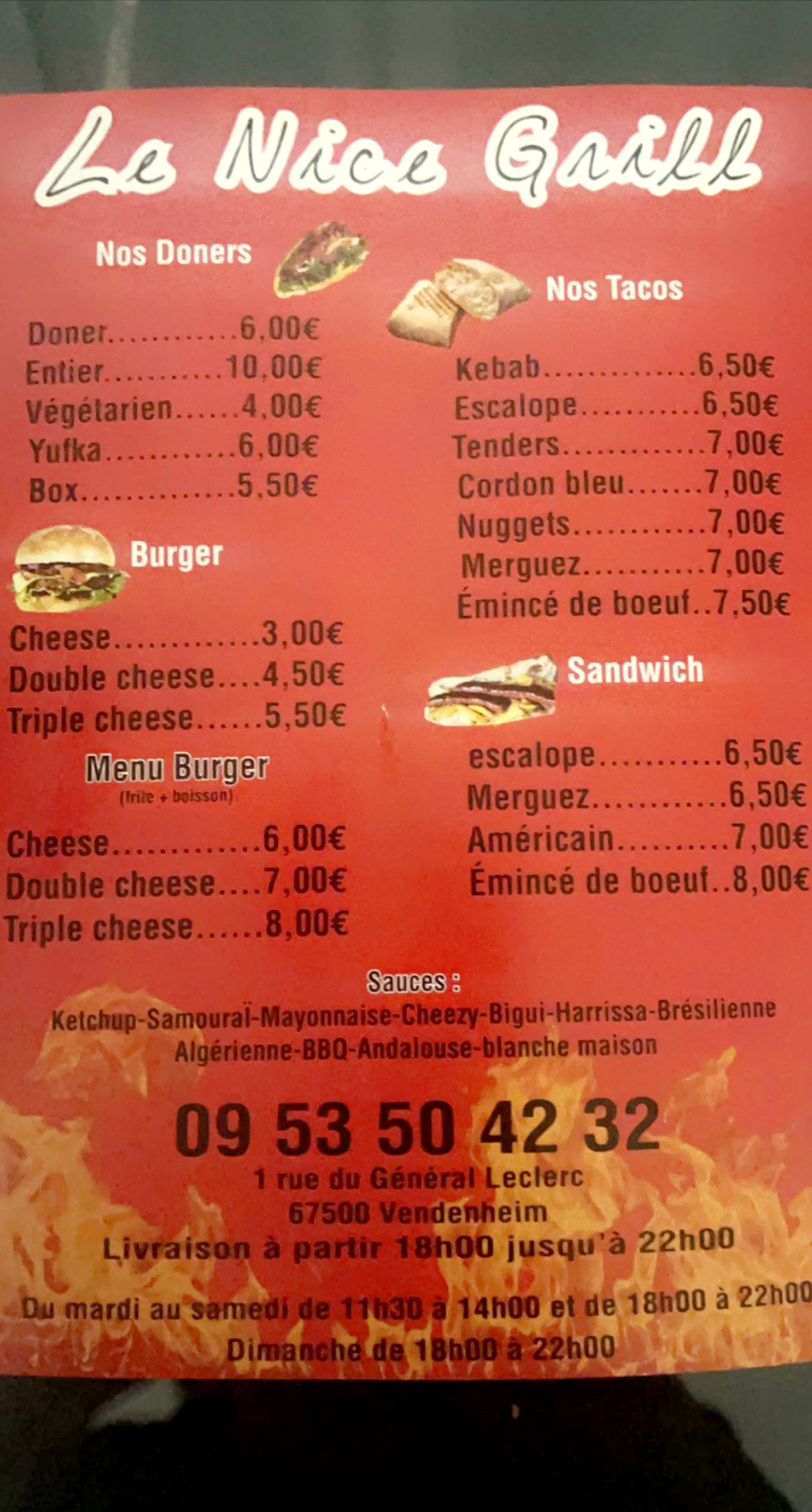 Découvrez toutes les informations concernant Grillades Le Nice grill qui se situe au 1 Rue du Général Leclerc, 67550 Vendenheim (67). Cette fiche inclut les photos, les horaires d'ouverture, l'adresse, le numéro de téléphone et les avis des clients.